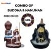 Combo Pack of 2 Backflow Incense Burners featuring “Lord Hanuman & Buddha Statue,” an artful blend of spiritual symbolism and aesthetic sophistication for your home decor. Finished in a sleek black, this combo pack is complemented by the inclusion of 101 free incense cones, offering an extensive and immersive aromatic experience in your sacred space.